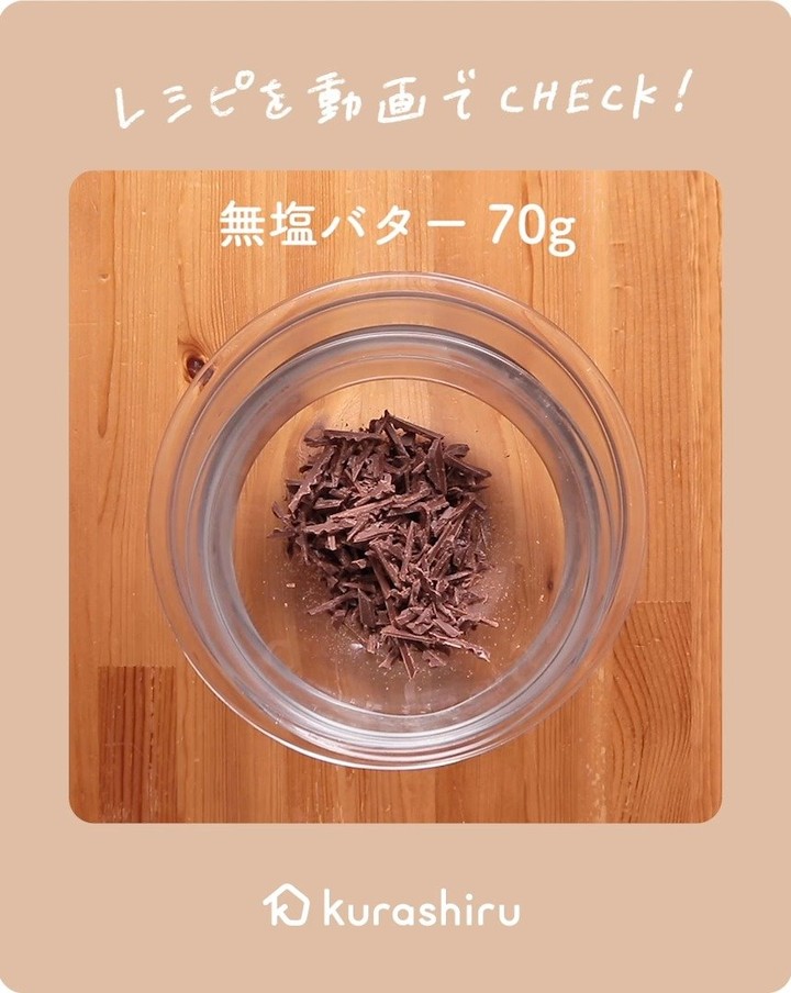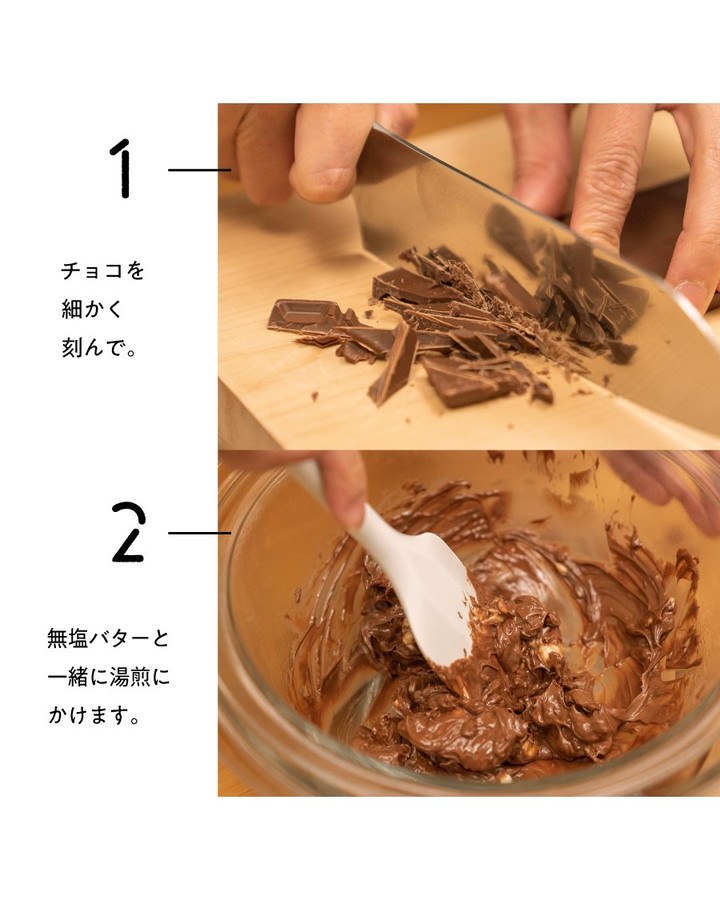 2. ボウルに1と無塩バターを入れ、湯せんにかけます。ゴムベラで混ぜ合わせ、ミルクチョコレートが溶けたら湯せんから外します。