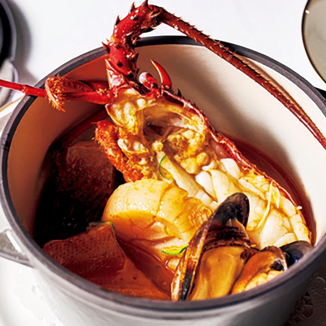 ①伊勢海老、ムール貝、ホタテ、カサゴなど魚介がふんだんに使われたブイヤベース