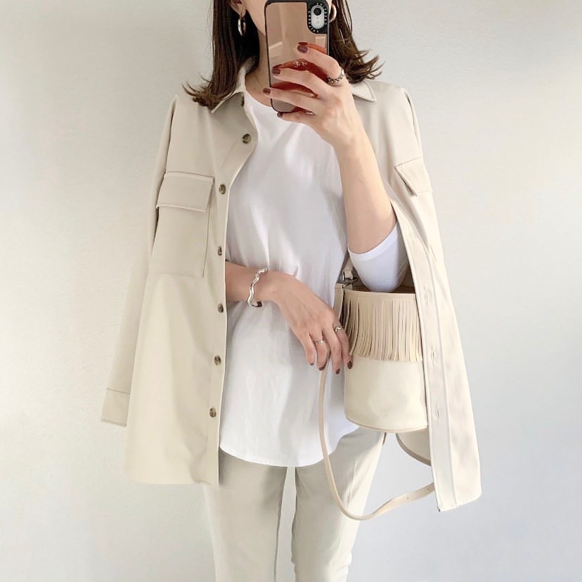 フェイクレザーダブルポケットシャツコーデをPick up!トレンドのフェイクレザー✨サッと羽織るのに、ちょうどいい軽さが魅力👌フェイクレザー なのに、ハードになりすぎないベージュがとっても爽やか👏素敵ですね🥰大人っぽいライトアウター🙌是非、チェックしてみてくださいね💁‍♀️💕
