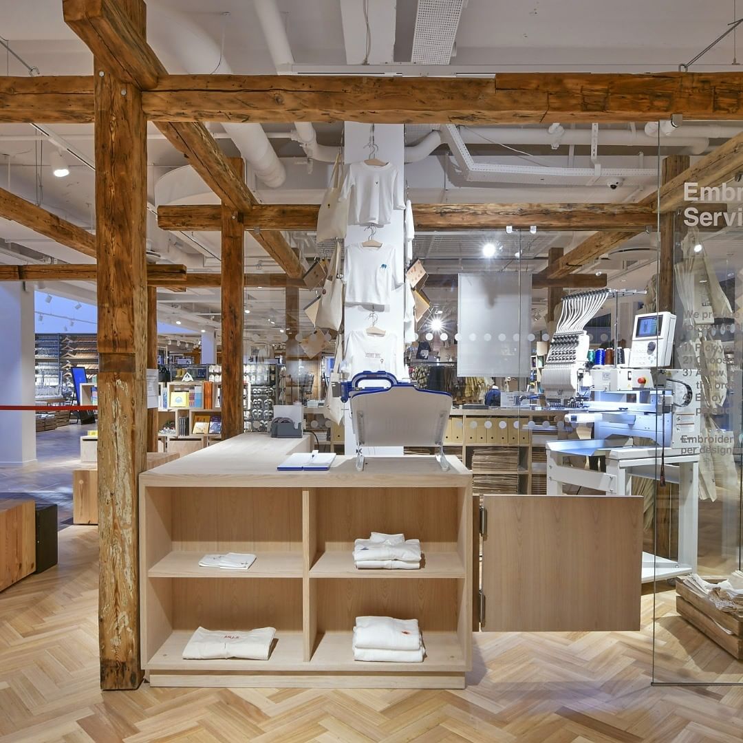 The flagship store is partially made from reclaimed wood sourced from multiple locations in Denmark, such as an old national hospital building originally built in 1910, an old factory located outside of Copenhagen and the Kastrup airport. Many of the walls in the flagship store are finished in a special Eco plaster, which is made from 100% recycled materials, and the artisan researched traditional Japanese installation techniques to ensure the movement in the plaster is authentic.