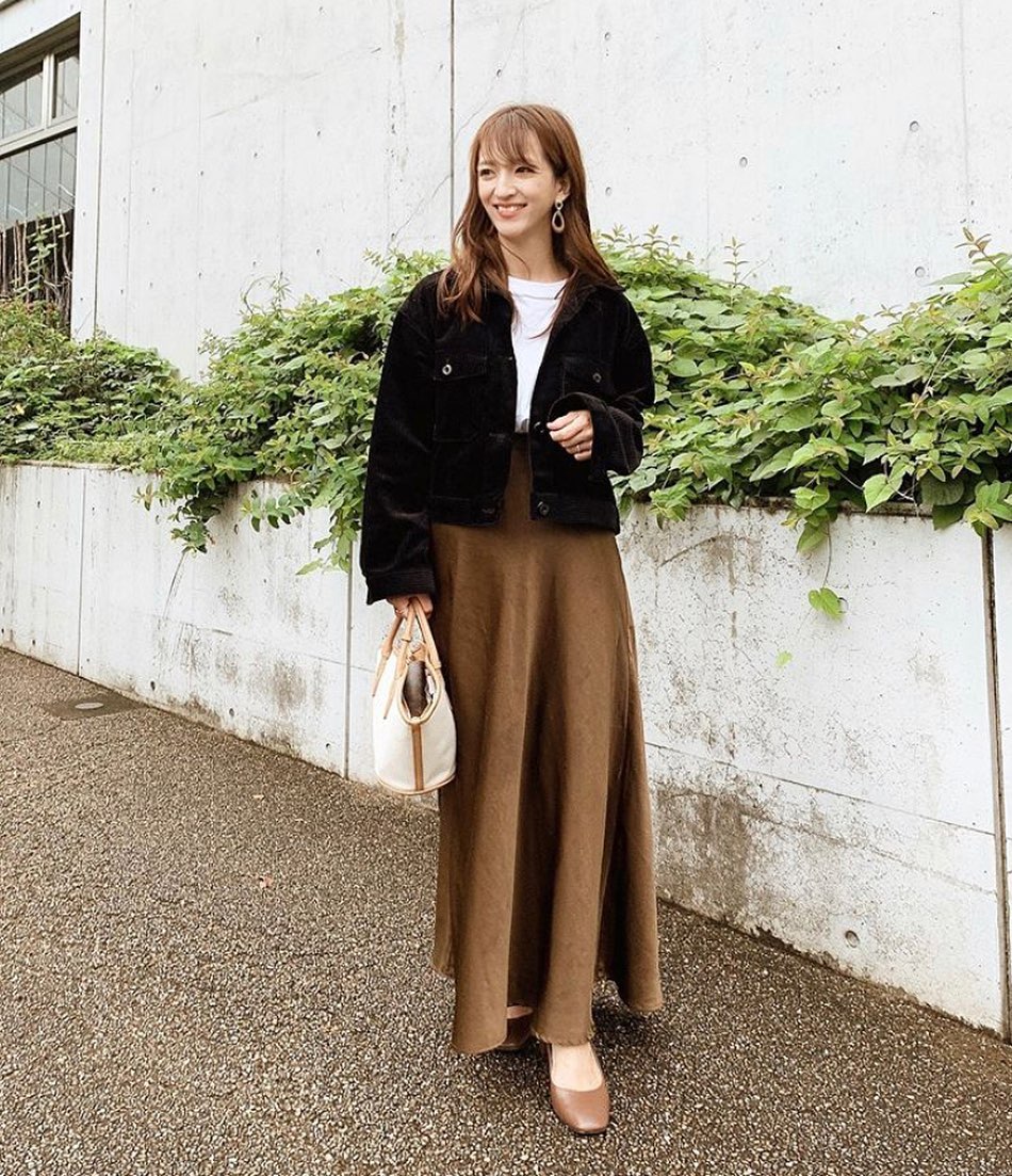 丈短めで、腕はポテっとゆるく着こなせるジャケットが今年っぽい✨ハイウエストからの、ロングシルエットのスカート合わせが絶妙👌素敵ですね🥰この時期に一着は持っておきたい、コーデュロイのアウター🙌