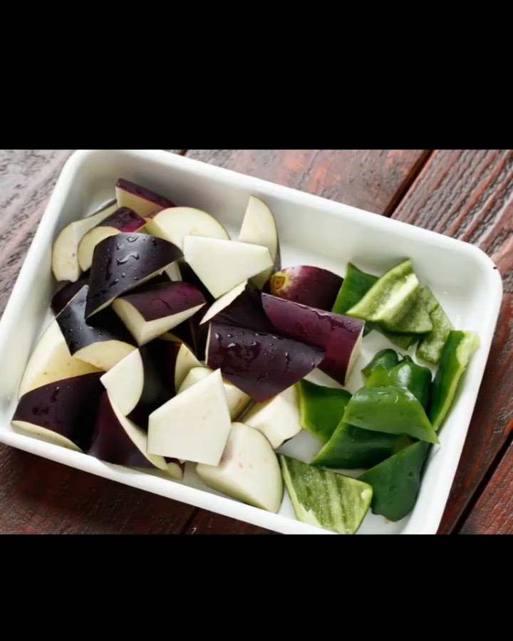 ①なすとピーマンは、一口大の乱切りにする。(なすはヘタを取り、ピーマンはヘタと種を取って♪)