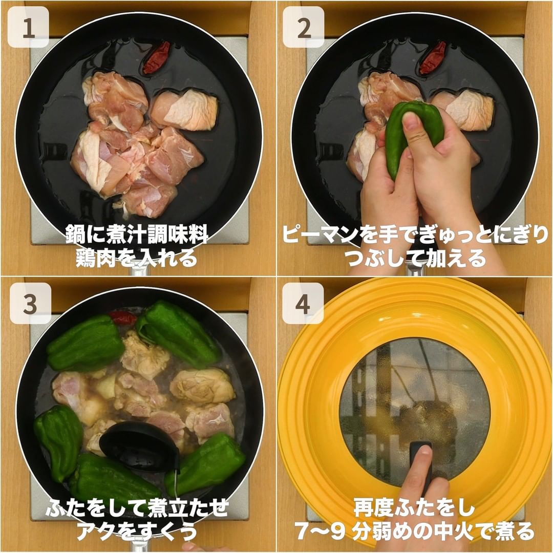 (1)鍋に☆、鶏肉を入れる。ピーマンを手でぎゅっとにぎり、つぶして加える。(ピーマンはヘタのまわりなど、よく洗いましょう。種は取り除かなくても食べられます。種やわたの食感が気になるようであれば、取り除いて作ってみてください♪唐辛子は、はぶいても美味しくいただけます。)