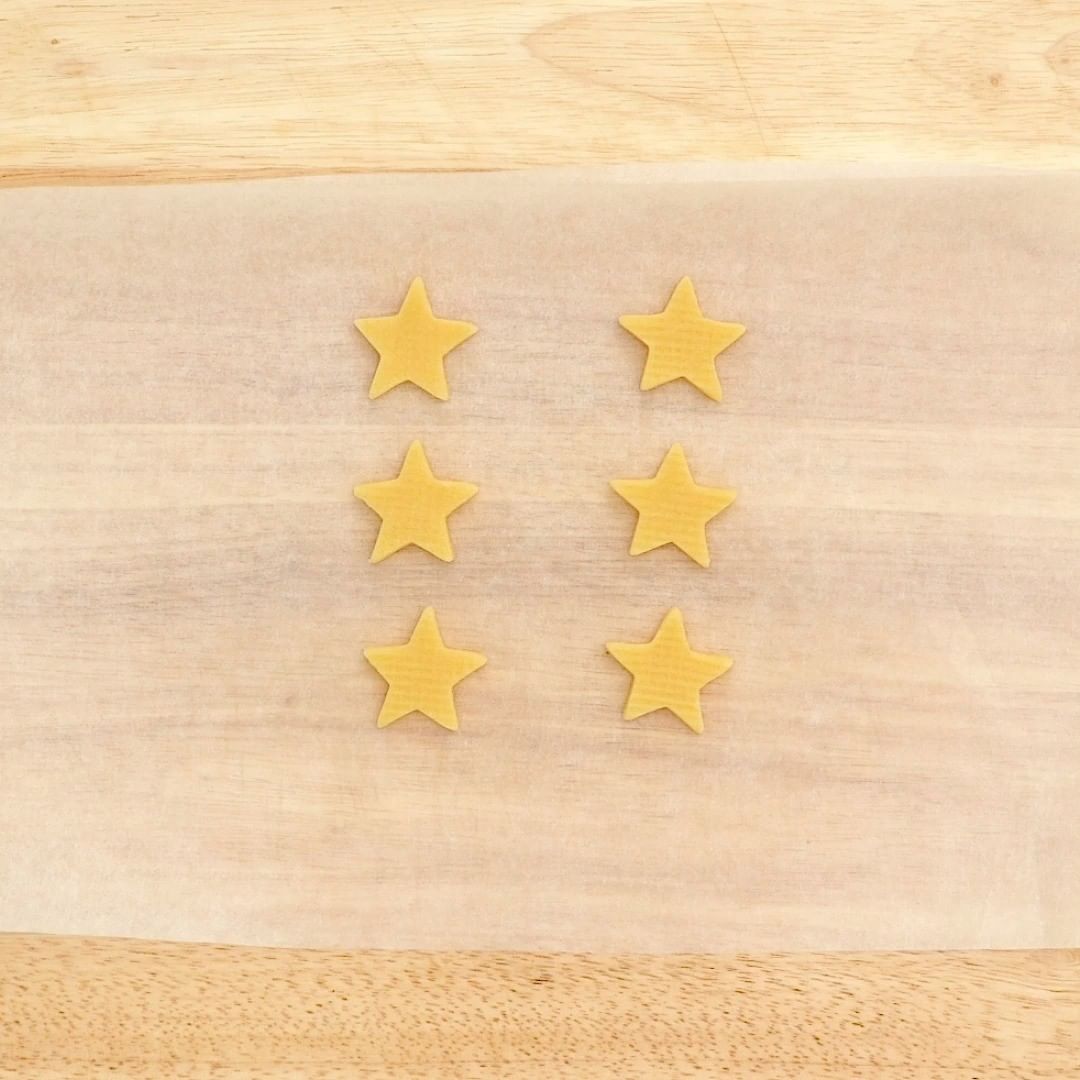 (3)クッキングシートを敷き、めん棒で5mmの厚さにのばし、星型で抜く。半量はさらに小さめの星型で抜く。卵白をハケでぬり、カラーシュガーを片面にまぶし、抜いた生地に再度はめ込む。冷蔵庫で10分程おく。果物ナイフなどで、コップの縁の厚さよりひとまわり厚めに切り抜く。(オーブンは冷蔵庫から取り出す際に180℃に予熱しはじめましょう。)