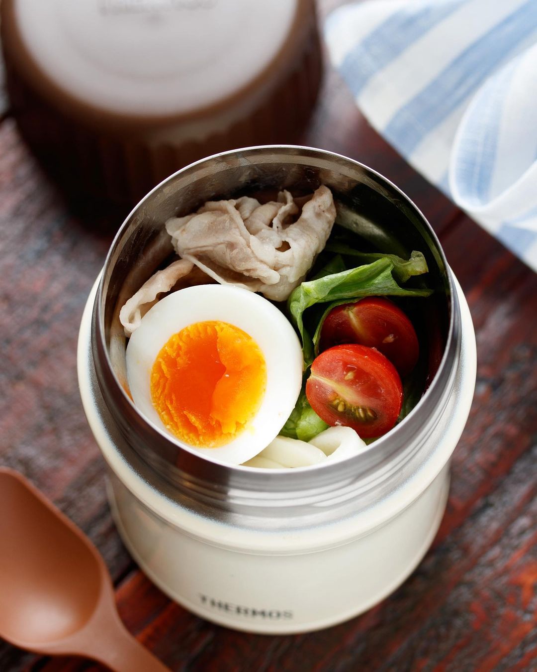 ③スープジャーの氷水を捨てて【a】を入れて混ぜ合わせ、うどんを加える。豚肉・ミニトマト・レタス・ゆで卵をトッピングしてフタをしめる。食べるときに、しっかり混ぜる。
