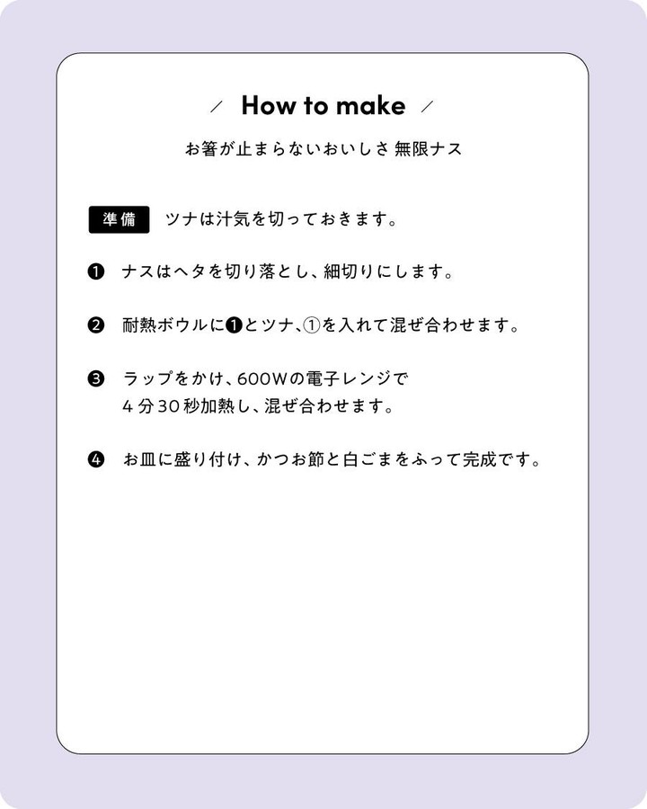 白いご飯にぴったりの、一度食べたら止まらないおいしさの一品です。なすを切ったら調味料を加えて電子レンジでチンするだけ!誰でもとても簡単においしく作れますよ。大人も子どもも大好きな味わいです、ぜひお試しください。