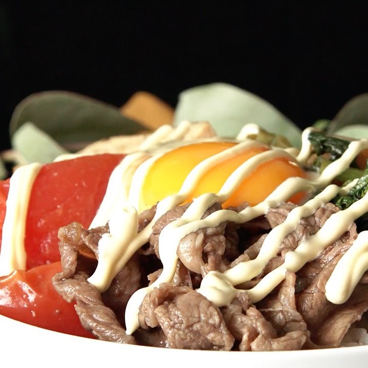 4. どんぶりにご飯をよそい、3をのせ、加熱したチーズ、卵黄とマヨネーズをのせる。⠀