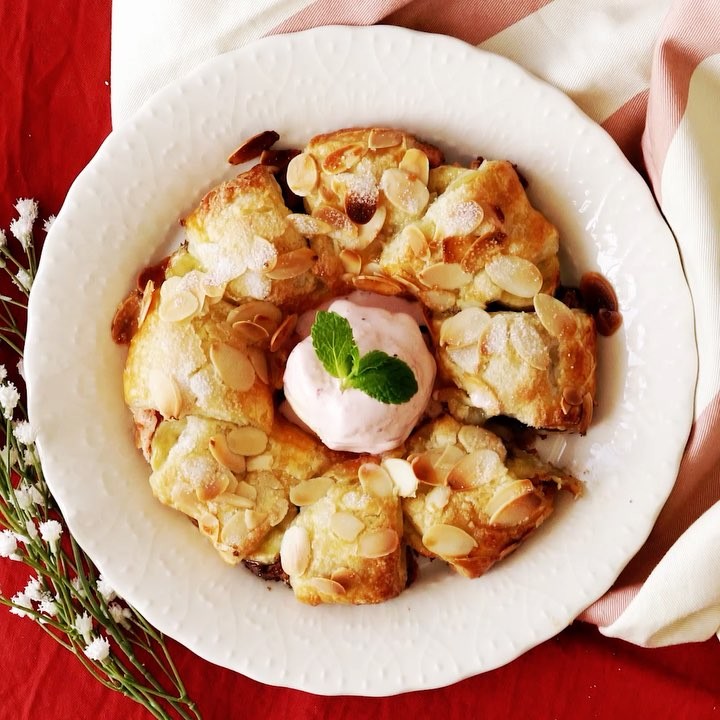 4.表面に卵液、スライスアーモンド、砂糖をふりかけ、200度に予熱したオーブンで15分焼く。