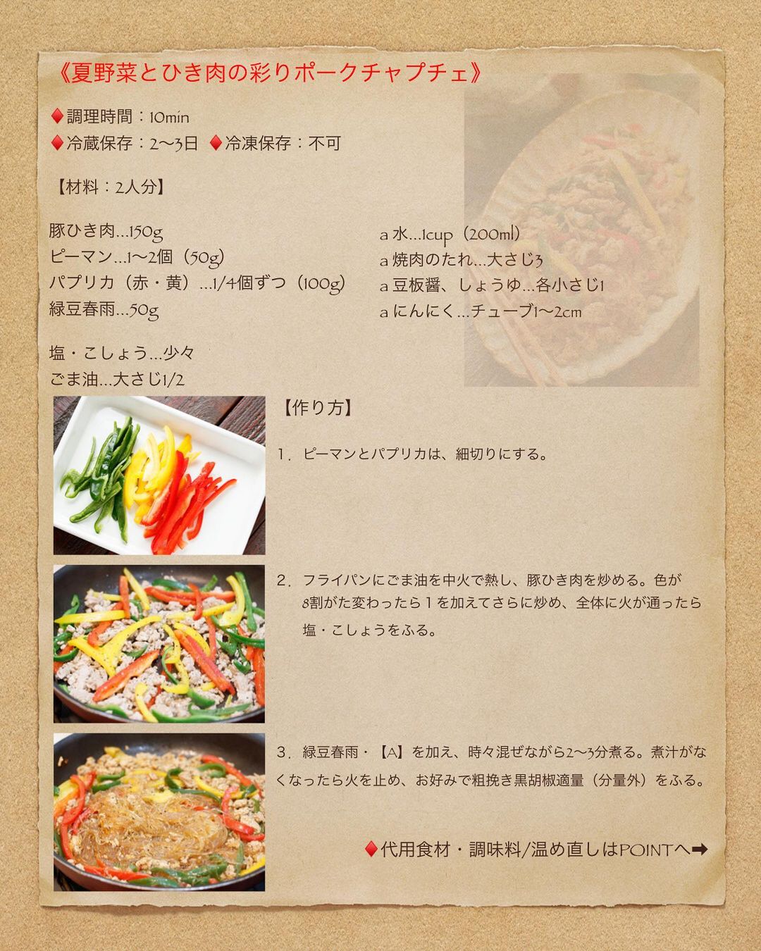 【 #夏野菜とひき肉の彩りポークチャプチェ 】#作り置き #お弁当 #水戻し不要 #野菜アレンジOK