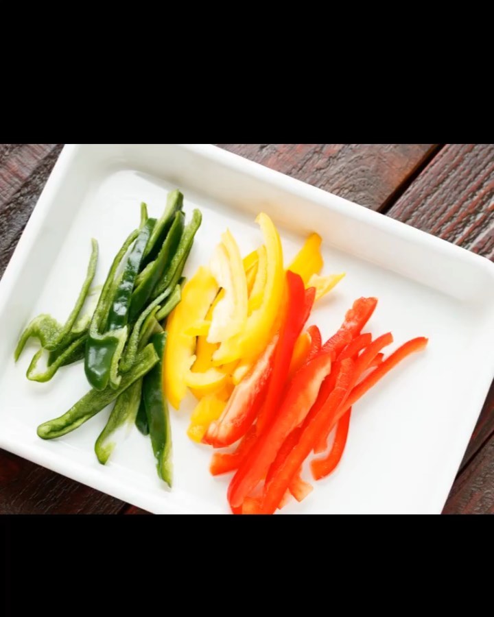 ①ピーマンとパプリカは、細切りにする。