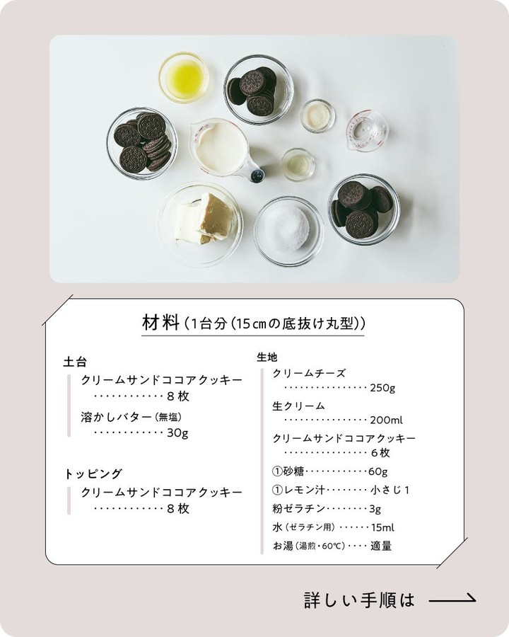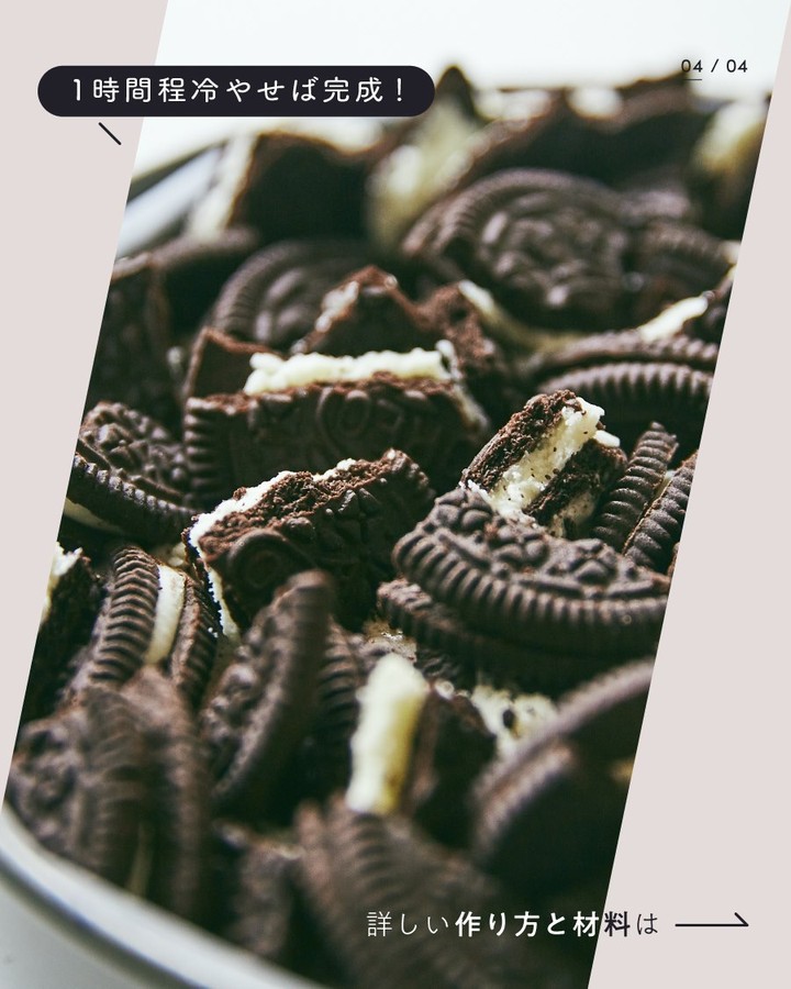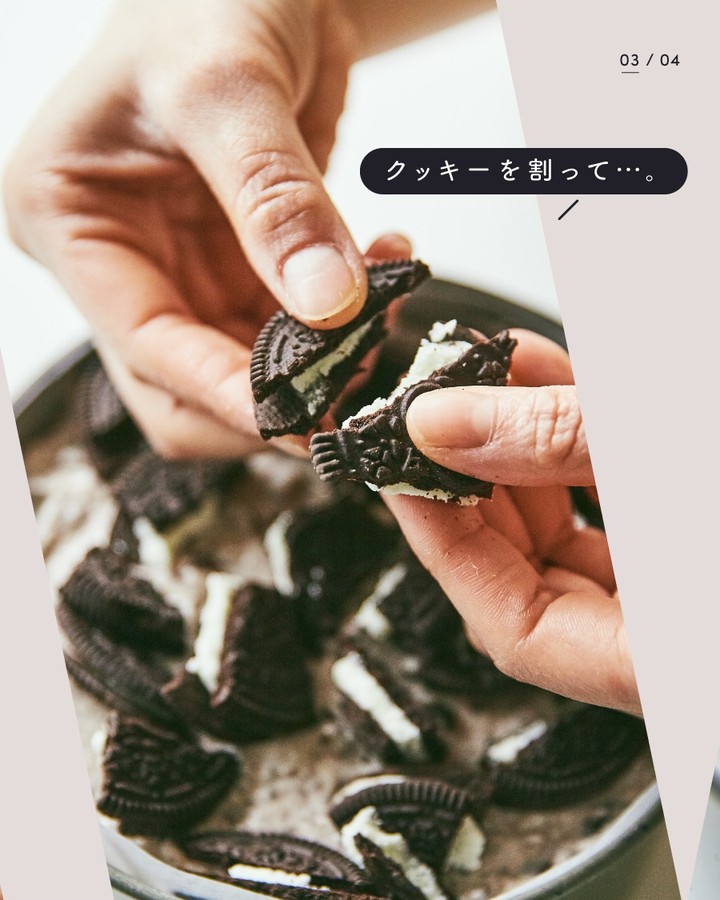 6. 1に流し入れトッピング用のクリームサンドココアクッキーを手で割りながらのせてラップをして冷蔵庫で1時間冷やします。固まったら切り分けて器に盛り完成です。