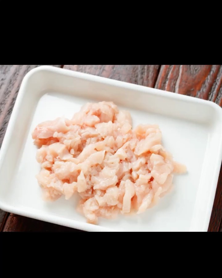 ①鶏肉は皮を取り、包丁で刻んだり叩いたりしながらミンチ状にする。(ある程度で🆗)