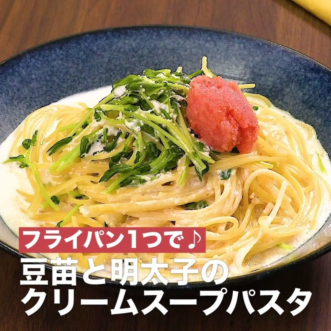 ②<フライパン1つで♪豆苗と明太子のクリームスープパスタ>