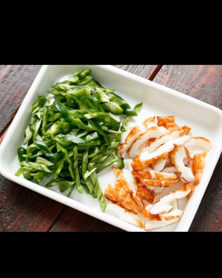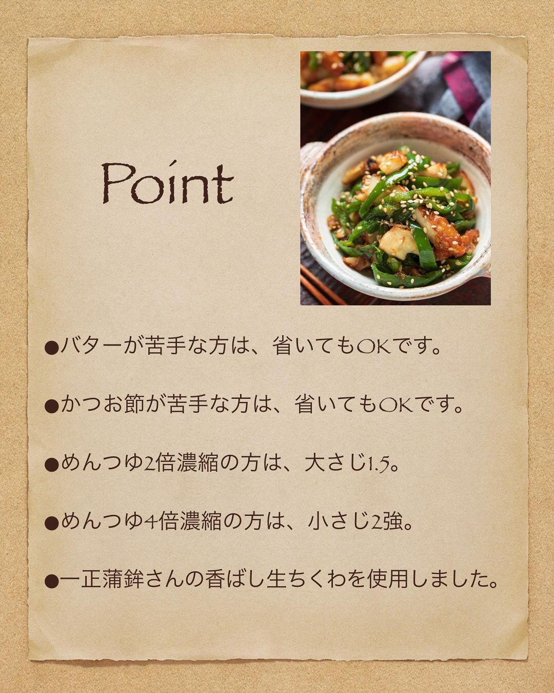 ①香ばし生ちくわは、縦半分に切ってから更に斜め薄切りにする。ピーマンは種とヘタを取って縦半分に切り、更に斜め薄切りにする。