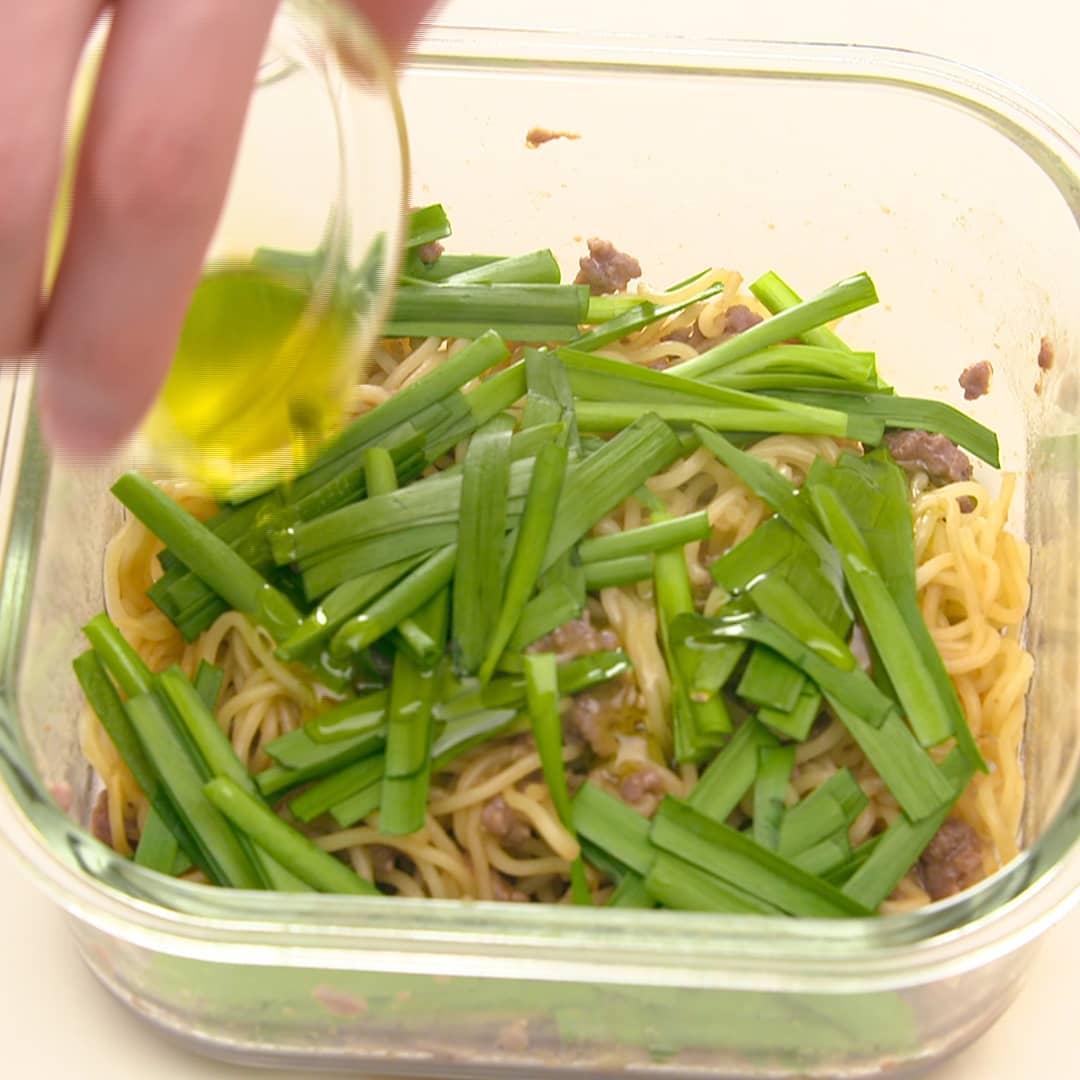 ①耐熱容器に焼きそば麺(1玉)と豚ひき肉60g、焼肉のタレ大さじ3、うま味調味料2ふりを入れ混ぜ合わせる