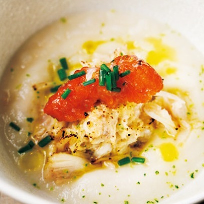 ③この日のアミューズは「オーガニック蕪のポタージュ」。ほぐしたワタリガニを炙り、内子とともにトッピング