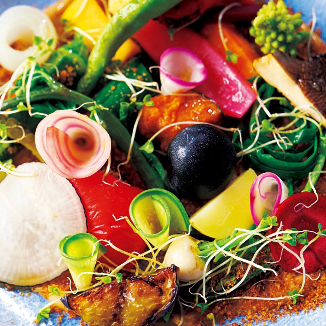 ①全8品で構成される、おまかせコース¥20,000。なかでも菜園風の「野菜料理」は定番で、太白胡麻油や赤味噌を使ったバーニャカウダ風ソース、自家製フォカッチャのパウダーの上に、20種以上の野菜を美しく盛り付けた