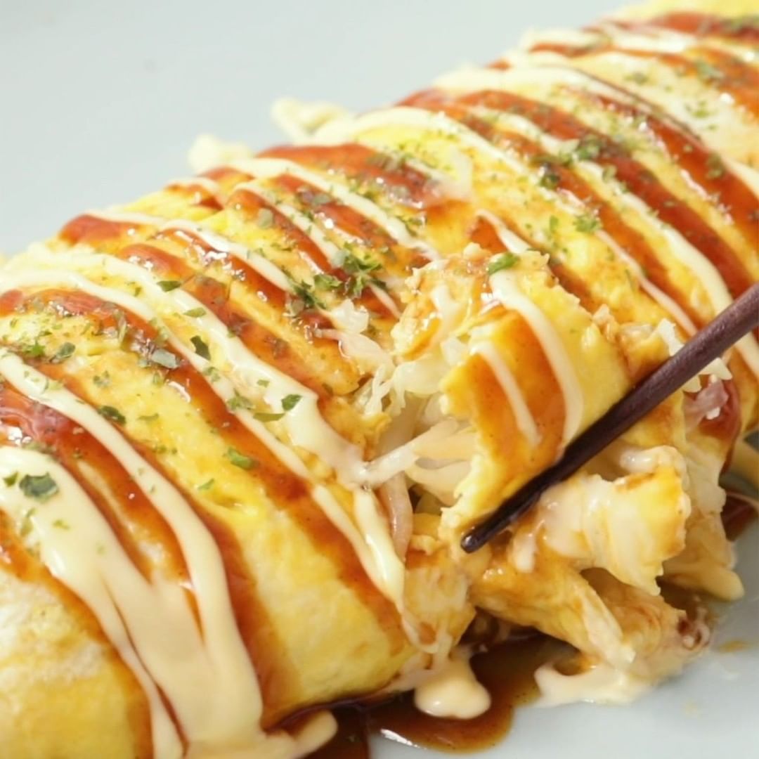 玉子は半熟の状態で火を止めましょう。野菜をのせて包んでいる間に余熱で火を入れることで、ふんわりとした食感に仕上がります。お好みで、野菜と一緒に豚小間肉を一緒に電子レンジで加熱して包むと、ボリューム感がアップします。