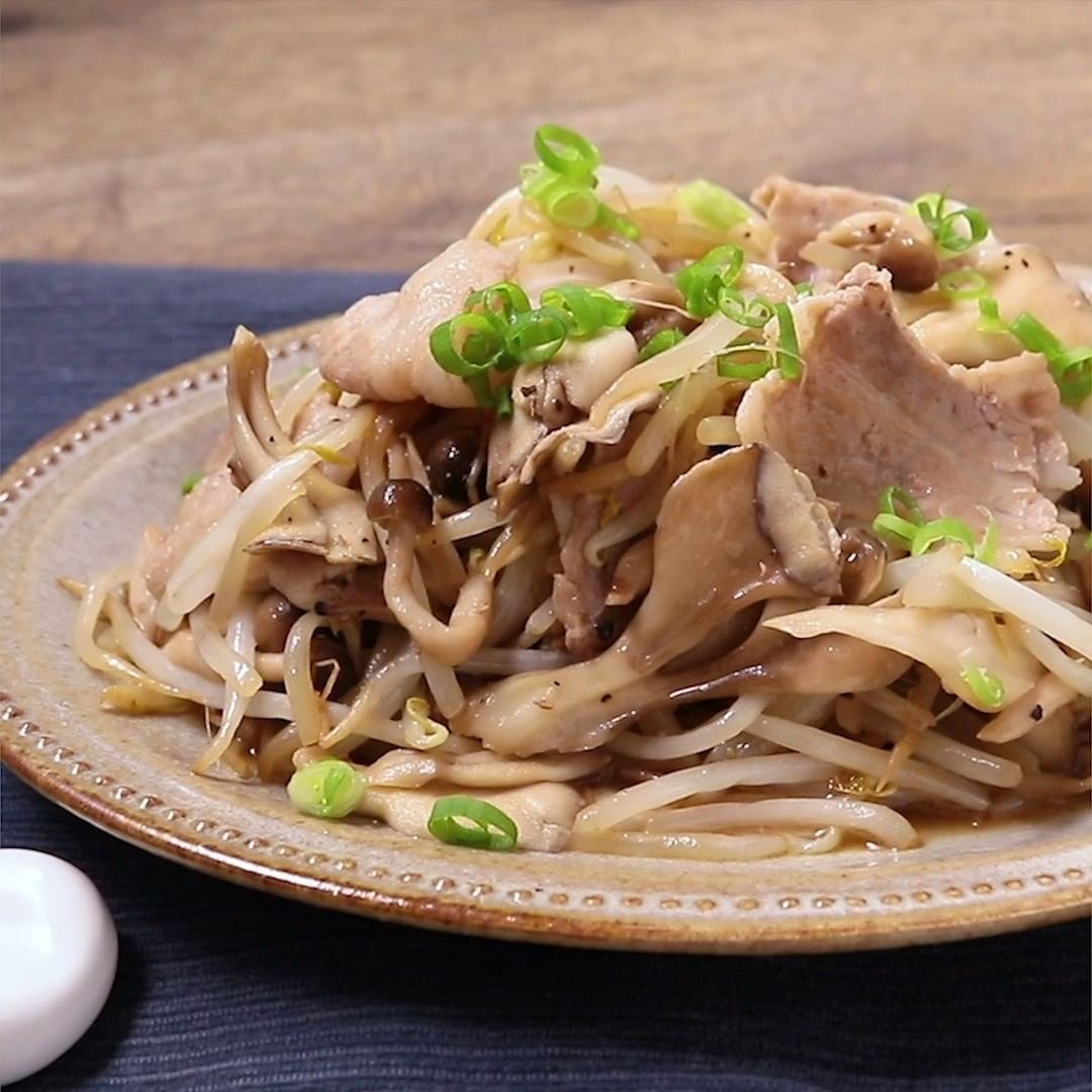 ②『たっぷりきのこともやしの豚バラポン酢炒め』