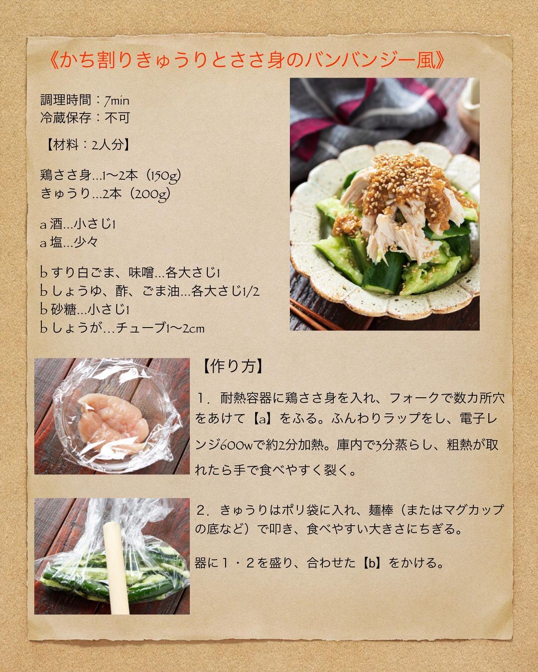 【 #かち割りきゅうりとささ身のバンバンジー風 】#包丁不要 #ポリ袋 #レンジ #ねりごま不要 #ごま味噌味