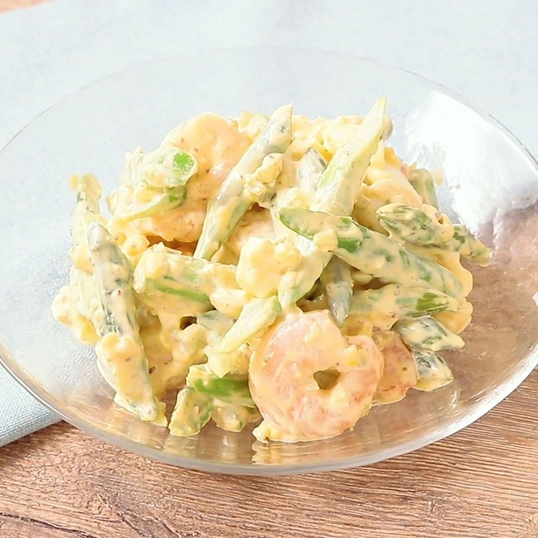 アスパラガスとエビのタルタルサラダはいかがでしょうか。シャキシャキのアスパラガスと、プリプリのエビがタルタルソースによく合い、とてもおいしいですよ。タルタルソースに入れたピクルスの程よい酸味と食感がいいアクセントになっています。ぜひお試しくださいね。