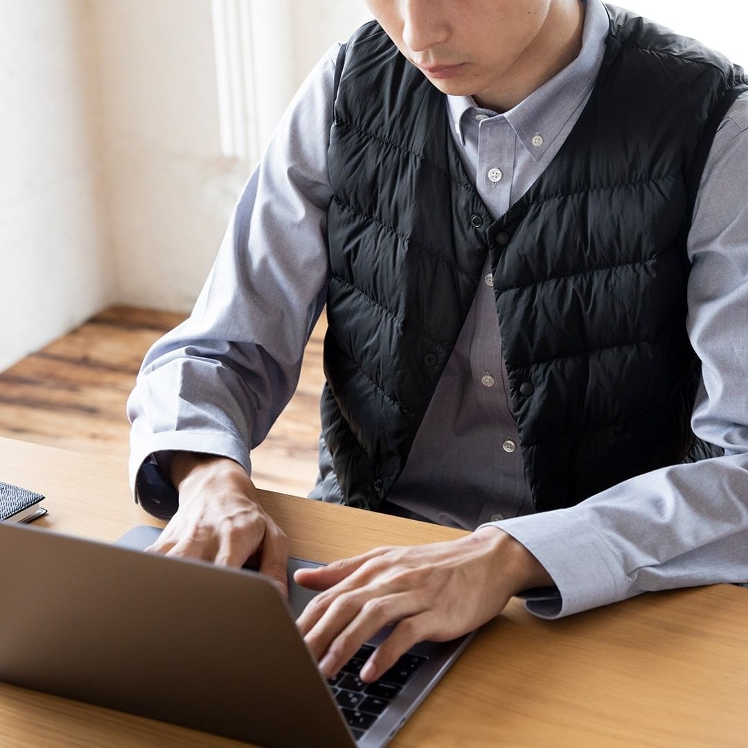 おうちの中でダウンベストを一枚、いつもの格好に重ねると、あたたかな空気が胴まわりに保たれ、冷えからからだを守ります。