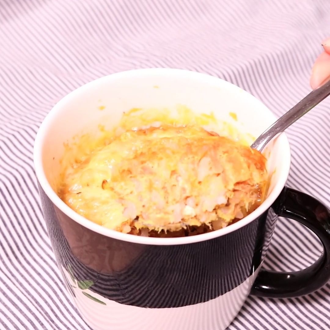 4. 耐熱性のマグカップに3を入れ、マヨネーズをぬり、溶き卵を流し入れふんわりラップをし、600Wの電子レンジで2分加熱し、卵が半熟状態になったらケチャップをかけて完成です。