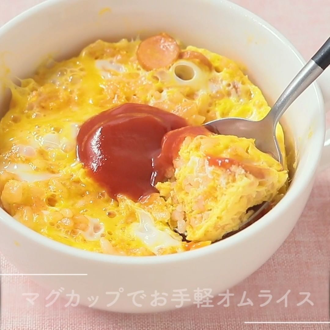 マグカップがあれば簡単に作れるオムライスはいかがでしょうか。電子レンジで加熱するだけでささっとすぐに作れる一品です。朝食や、ランチにおすすめです。お好みの具材を加えてアレンジしてみてください。ぜひお試しください。