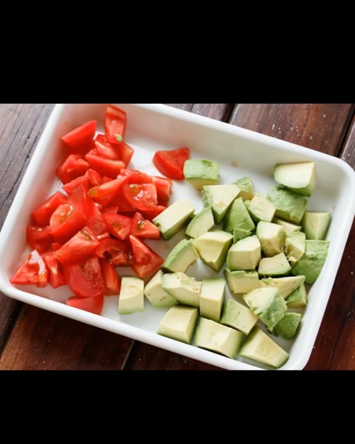 ①アボカドは皮と種を取り、食べやすい大きさの角切りにする。トマトは、アボカドと同じくらいの大きさに角切り(乱切りでも!)にする。