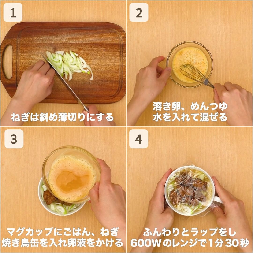 (3)マグカップにごはんを盛り、ねぎ、焼き鳥缶をのせ、2をかける。(マグカップは耐熱性の大きいものを使用しましょう。焼き鳥缶は缶汁ごと使います。)