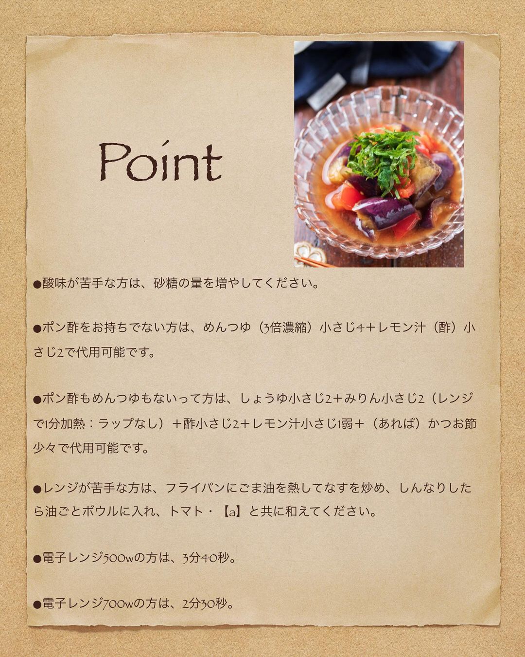 ④なすに熱が通ったら、トマト・【a】を加えて混ぜ合わせる。粗熱を取ったら完成!(冷やすとさらに美味しい!)