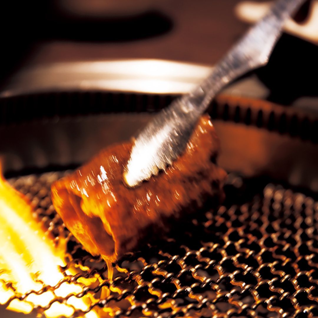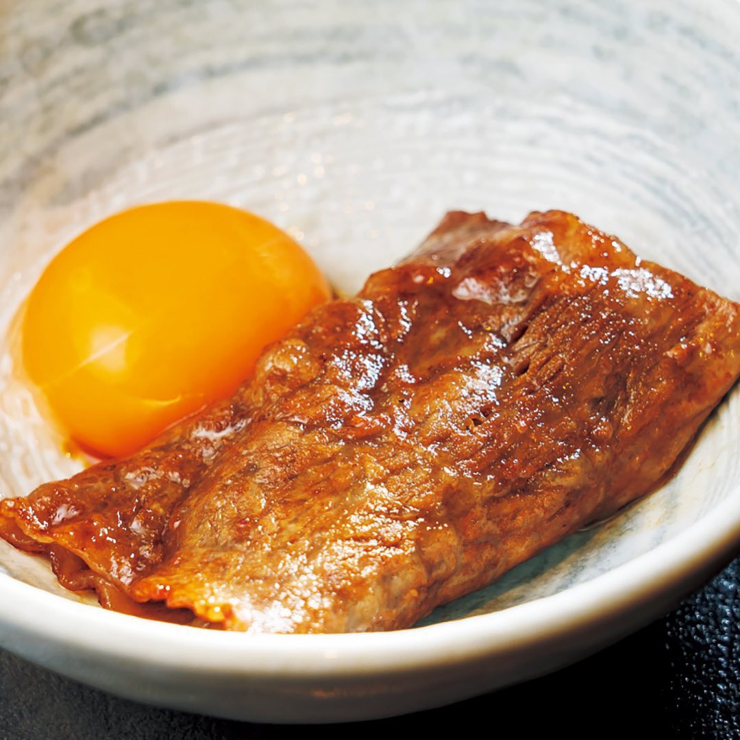 ②③上品なサシが入った「上ロース」はサッと炙るようにして焼きすぎないでいただくのがベスト。もみダレの香ばしさと肉の甘みを卵黄がバックアップする