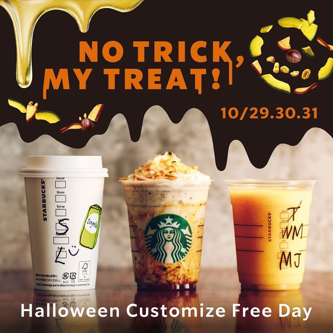 @Starbucks Starbucks: 今年のハロウィンは頑張ってきた自分にご褒美を 10/29から3日間、ご注文時にこの画像をバリスタに見せてオーダーいただくと、お好きなドリンクへ5… 2020-10-28 🎃☕️ 今年のハロウィンは頑張ってきた自分にご褒美を✨ 10/29から3日間、ご注文時にこの画像をバリスタに見せてオーダーいただくと、お好きなドリンクへ50円(税抜)の有料カスタマイズ1点を無料で、もしくは100円(税抜)の有料カスタマイズ1点を50円(税抜)でお楽しみいただけます😊 詳しくはストーリーズのリンクをご覧ください。 #NoTrickMyTreat #ハロウィンカスタマイズフリー #スターバックス Ciao, Nihon.