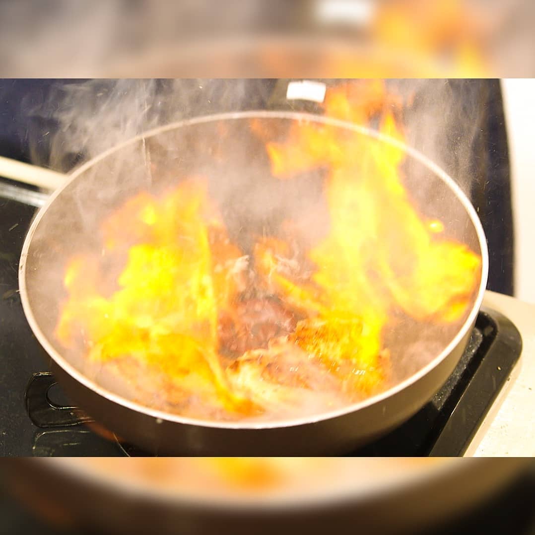 ④皮目がこんがり焼けたら裏返し、白ワイン(大さじ2)を入れフランベする。