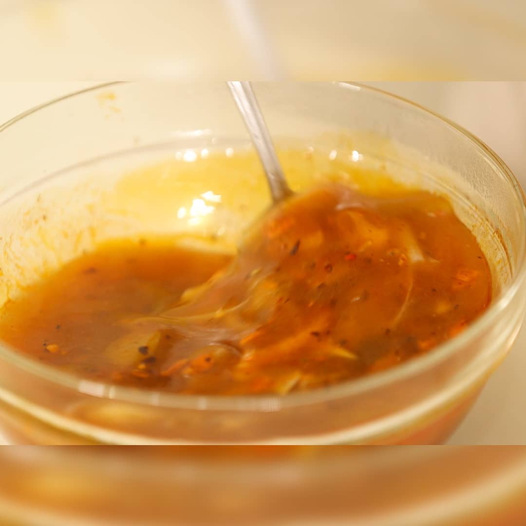 ⑤ 水溶き片栗粉(適量)を入れてとろみをつけ、食べるラー油(大さじ1)を入れ、かき混ぜればあんが完成!