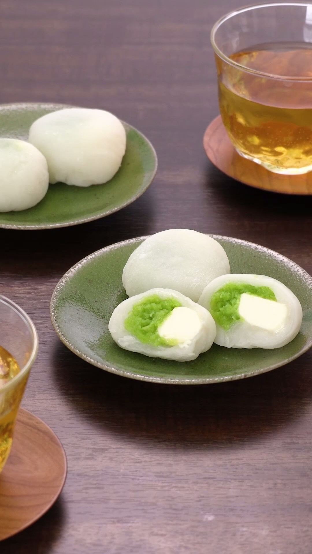 (6)薄く円形にのばす。中央に1/8量のずんだあんをしぼり出し、クリームチーズを中央にのせて包み、まるく形をととのえる。同様に計8個作る。