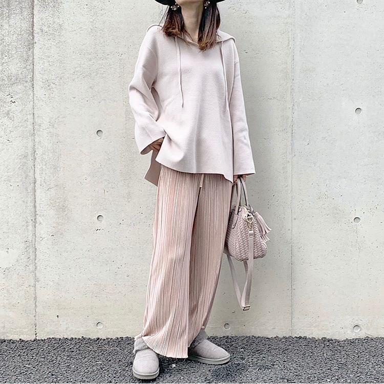 スウェットライクフーディニットチュニックコーデをPick up!しっとりとした素材感が、本当に気持ちいいスウェットライクニット✨程よい落ち感を、トーンを揃えたスタイリングに上手に取り込んで、大人なフェミニンコーデの完成ですね😘大きめフードが、お洒落に決まっていてGOOD👍