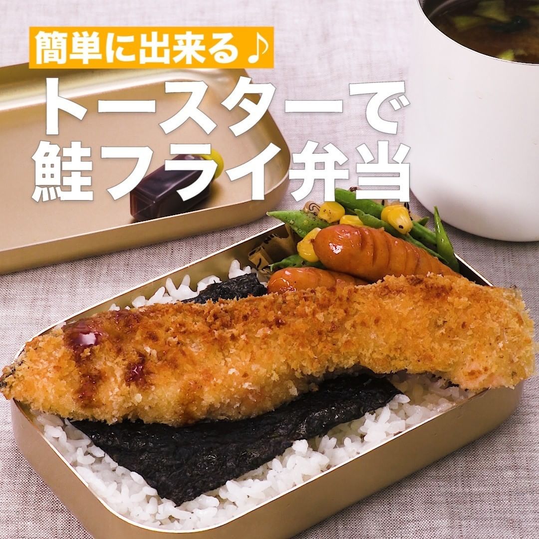 パン粉は油を少しプラスしてさっくり仕上げます!ソーセージと添え野菜を一緒にのせてトースターで焼いて時短に♪忙しい朝にピッタリのお弁当レシピはいかがでしょうか?鮭フライの他にハムカツなどアレンジもおすすめです。