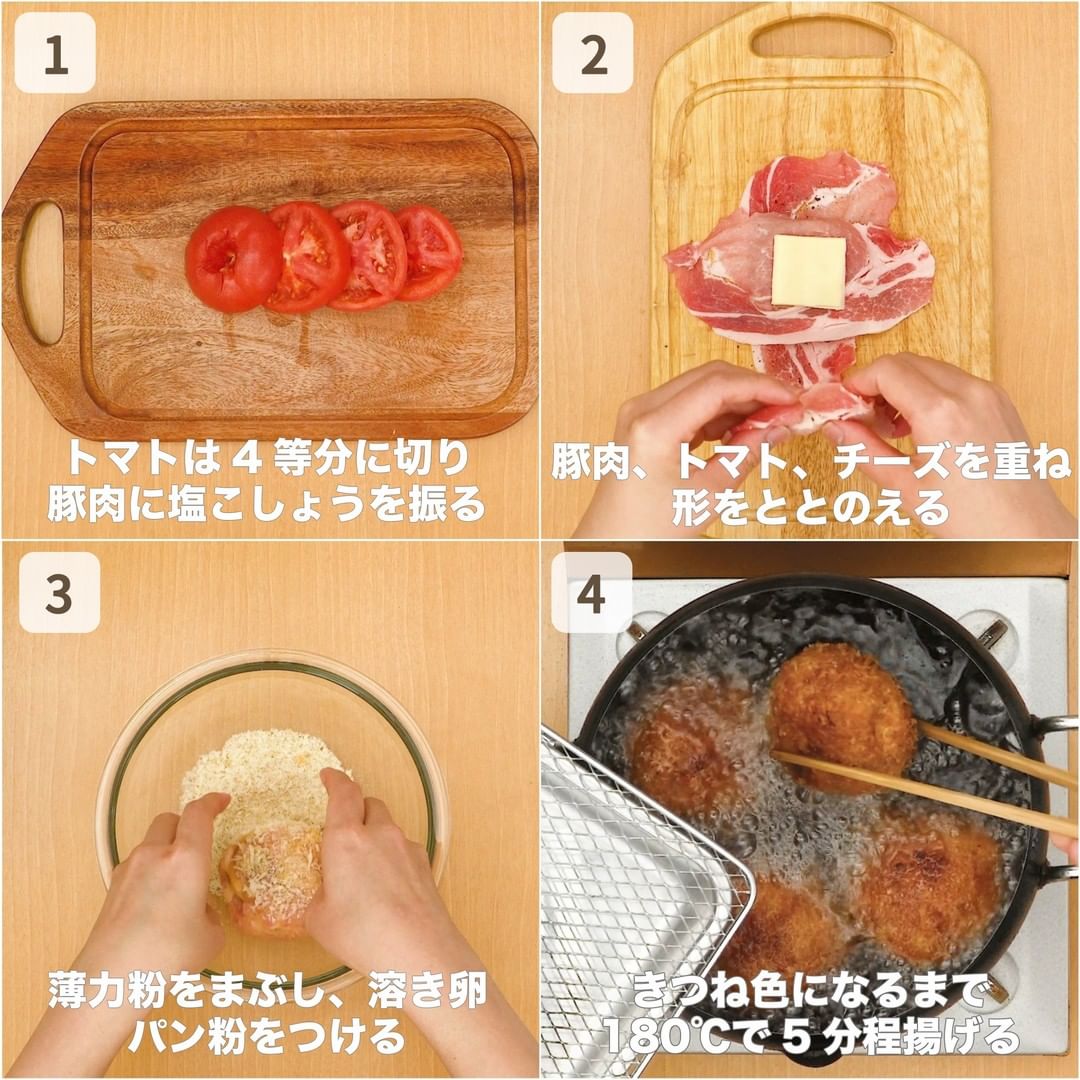 トンカツの中に輪切りにしたトマトとチーズを入れたボリュームおかずをご紹介♪加熱してトロッととろけたトマトと濃厚チーズが溢れ出ます!