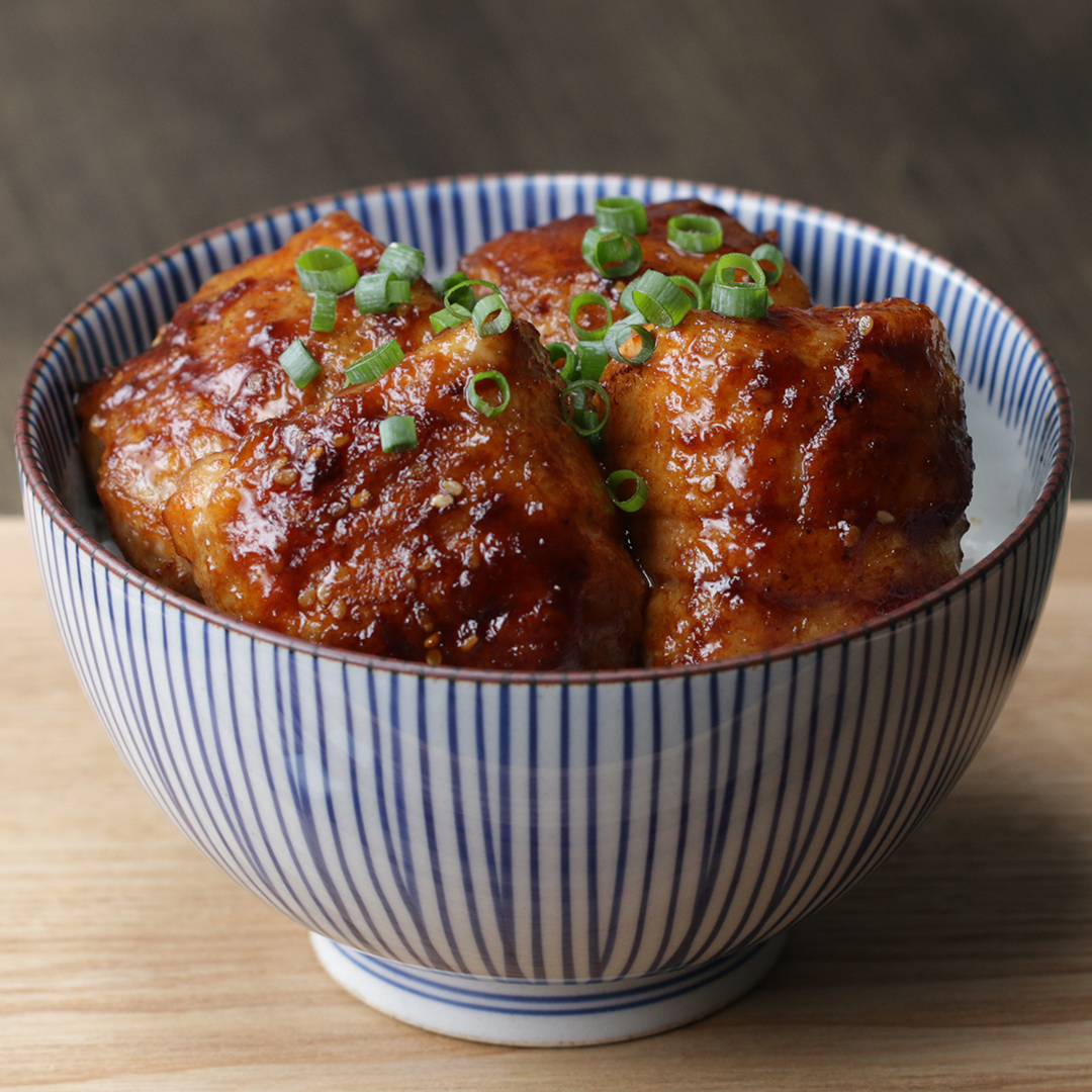 7.丼にご飯を盛り、(6)を乗せ、万能ねぎを散らしたら、完成!⁣