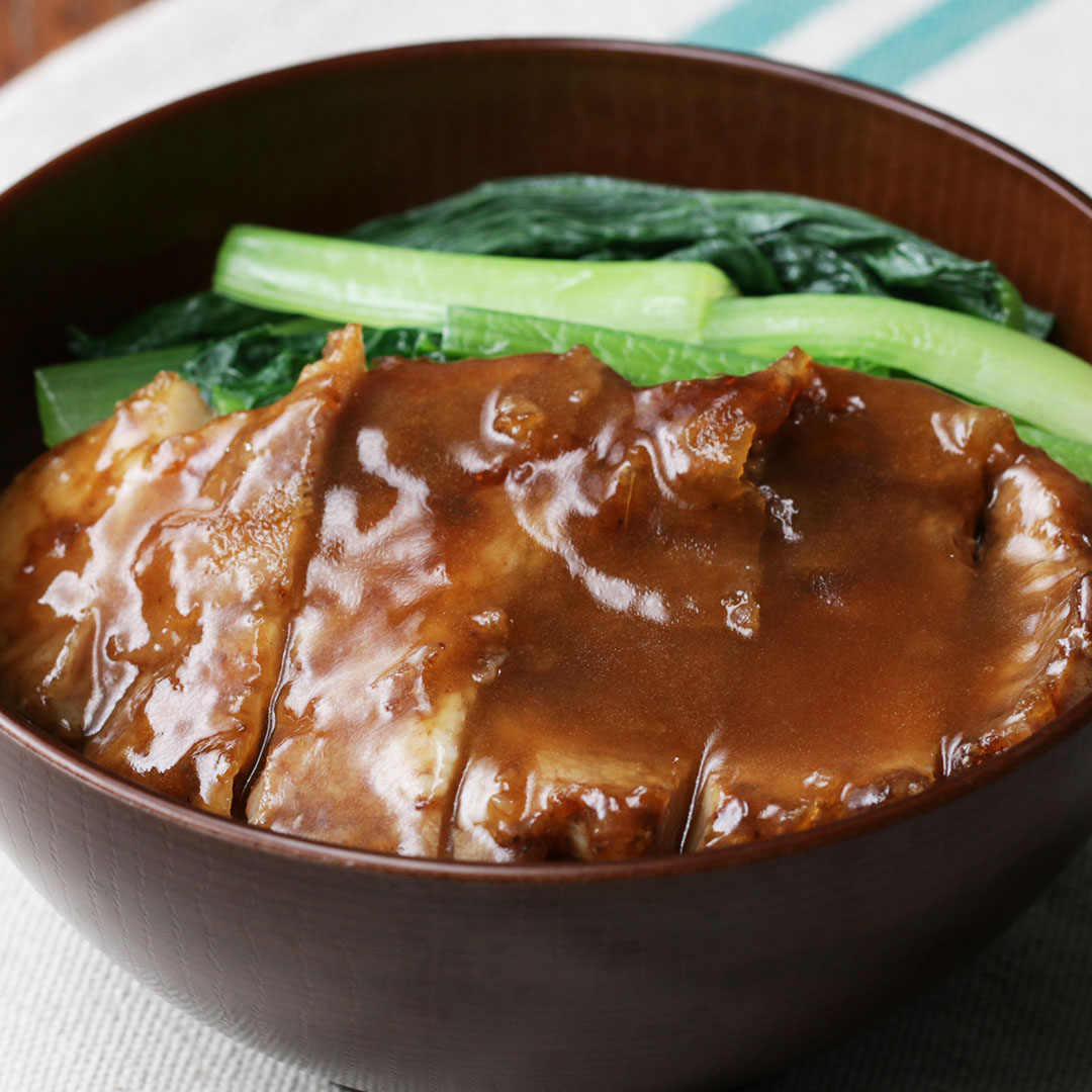 6.丼にご飯を盛って豚肉、小松菜をのせ、あんをたっぷりとかけたら、完成!