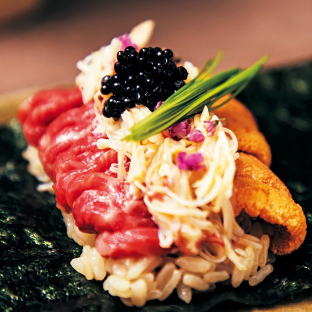 霜降り肉のすき焼きのほか、生うにと赤身の手巻き、トリュフユッケなど