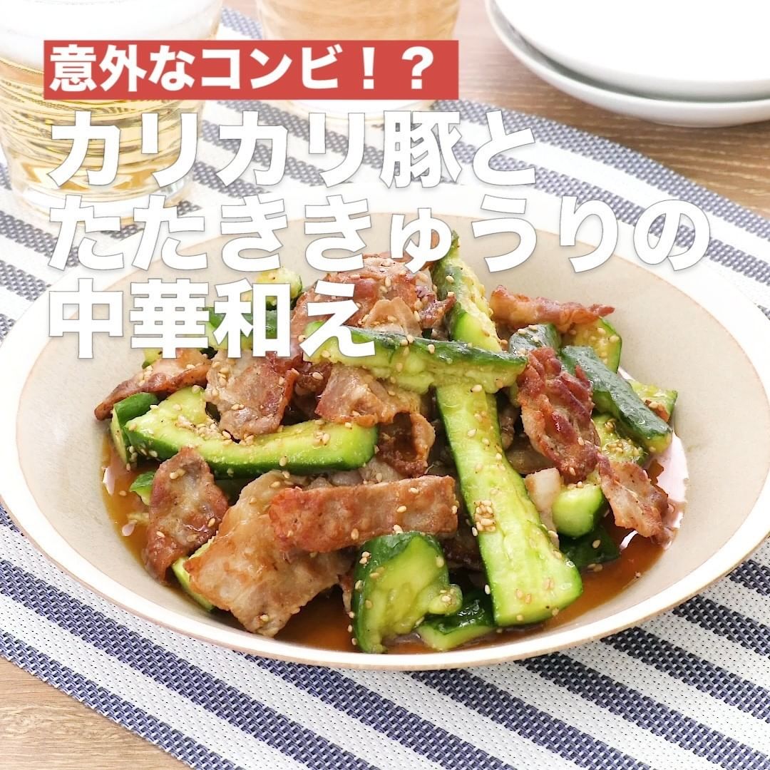 じっくりとカリカリに焼いた豚バラ肉と、たたききゅうりを中華だれで和えた簡単一品をご紹介。きゅうりはたたくことで、味がからみやすく、食感を楽しめます。おつまみにいかがですか?