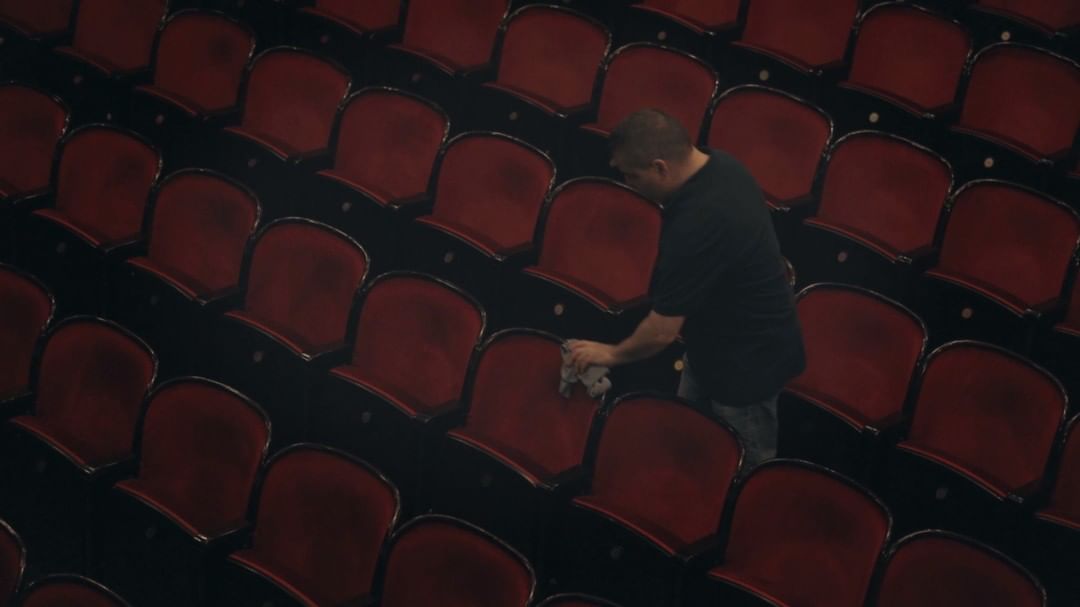 Walking through the theater aisles wiping down the backs of the seats one by one