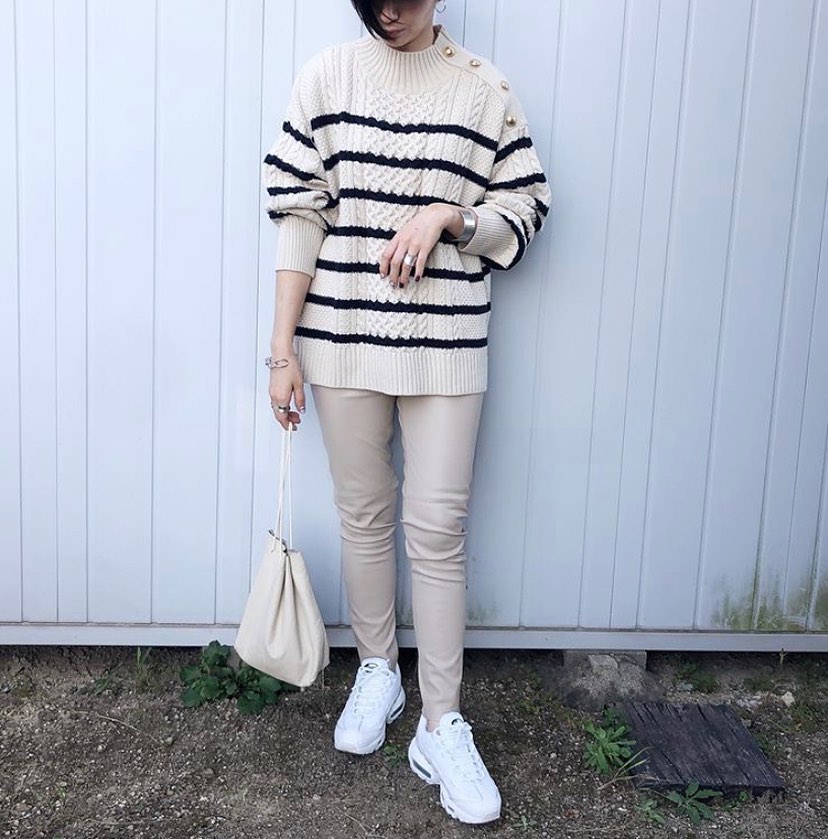 ケーブルボタンセーターコーデをPick up!ざっくりケーブル編みが可愛くて、肩の金ボタンもアクセント✨大人カジュアルに、ボーダーは外せない👌ベージュのボトムスとのバランスも抜群ですね😘トレンドライクに、大きめサイズチョイスもGOODです👍是非、チェックしてみてくださいね💁♀️💕