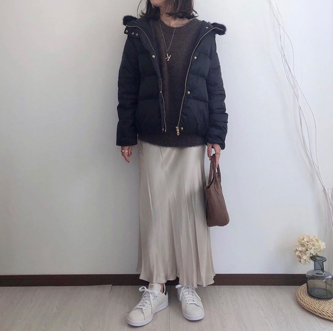 シンプルで着膨れしない程よさがGOODな、ダウンジャケット😘フワフワのファーがついたフードが、フェミニンさもプラスしてくれて良い感じ👍ロングスカートにもぴったりな、バランスの良さが決め手ですね🙌