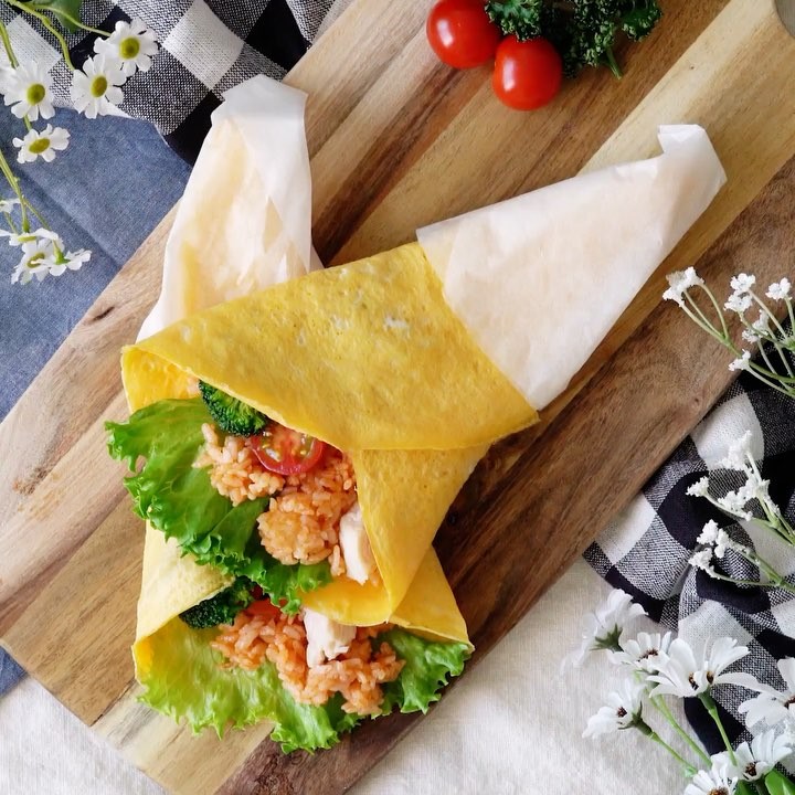 4. 薄焼き卵に具材をのせて巻く。⠀